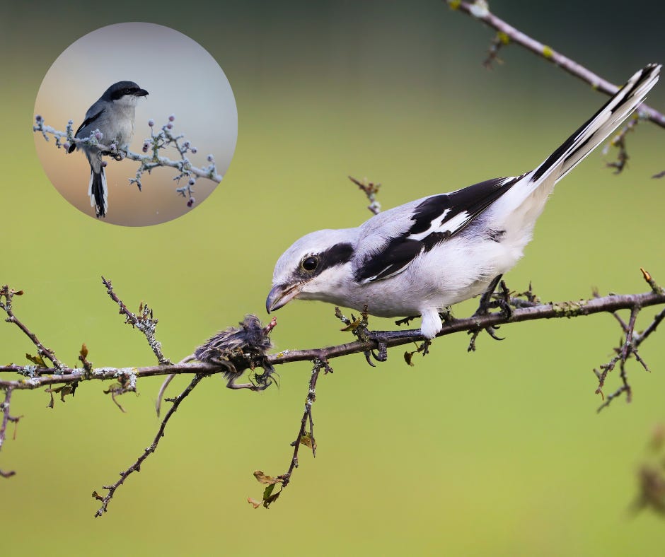 The Great Grey Shrike preys upon small mammals, insects and beetles and stores its prey on thorns. Barbaric? It may seem that way but by doing so, the bird has created a useful larder for its deadly meat fest.